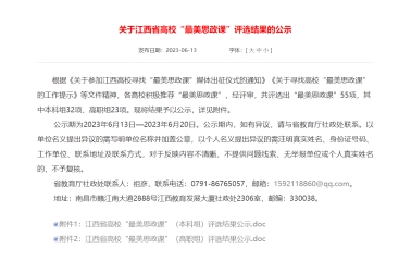 根据《关于参加江西高校寻找“最美思政课”媒体出征仪式的通知》《关于寻找高校“最美思政课”的工作提示》等文件精神,各高校积极推荐“最美思政课”,经评审,共评选出“最美思政课”55项,其中本科组32项、高职组23项。koko体育koko体育官网许恒韬老师主讲的《中国化时代化的马克思主义行》、陈放香老师主讲的《文化有大美 自信以持之》两项作品均评选为江西省高校“最美思政课”。