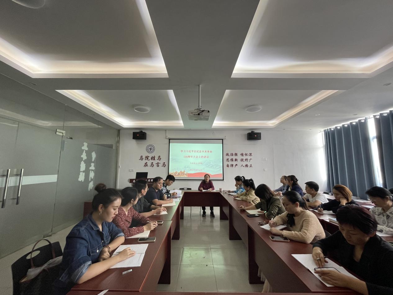 周丽琴院长强调,围绕辛亥革命110年以来的历史征程,总书记的讲话铿锵有力、掷地有声、发人深省。大学者,非谓有大楼之谓也,有大师之谓也。高校教师承担着最庄严、最神圣的历史使命,我们要深刻领会习近平总书记重要讲话精神,坚持中国共产党的领导和中国特色社会主义道路,继承和弘扬辛亥革命精神,将辛亥革命精神融入到思政课的教学内容中。