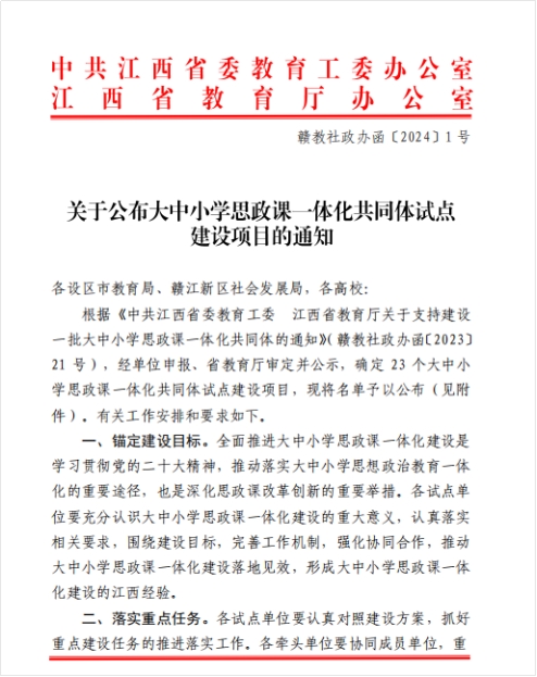 koko体育官网讯(文:陈洋安) 近日,中共江西省委教育工委、江西省教育厅发布了《关于公布大中小学思政课一体化共同体试点建设项目的通知》,全省确定23个大中小学思政课一体化共同体试点建设项目。koko体育成功入选由南昌工程学院牵头以及南昌师范学院、兴国县第三中学牵头申报的江西省大中小学思政课一体化共同体试点建设项目。