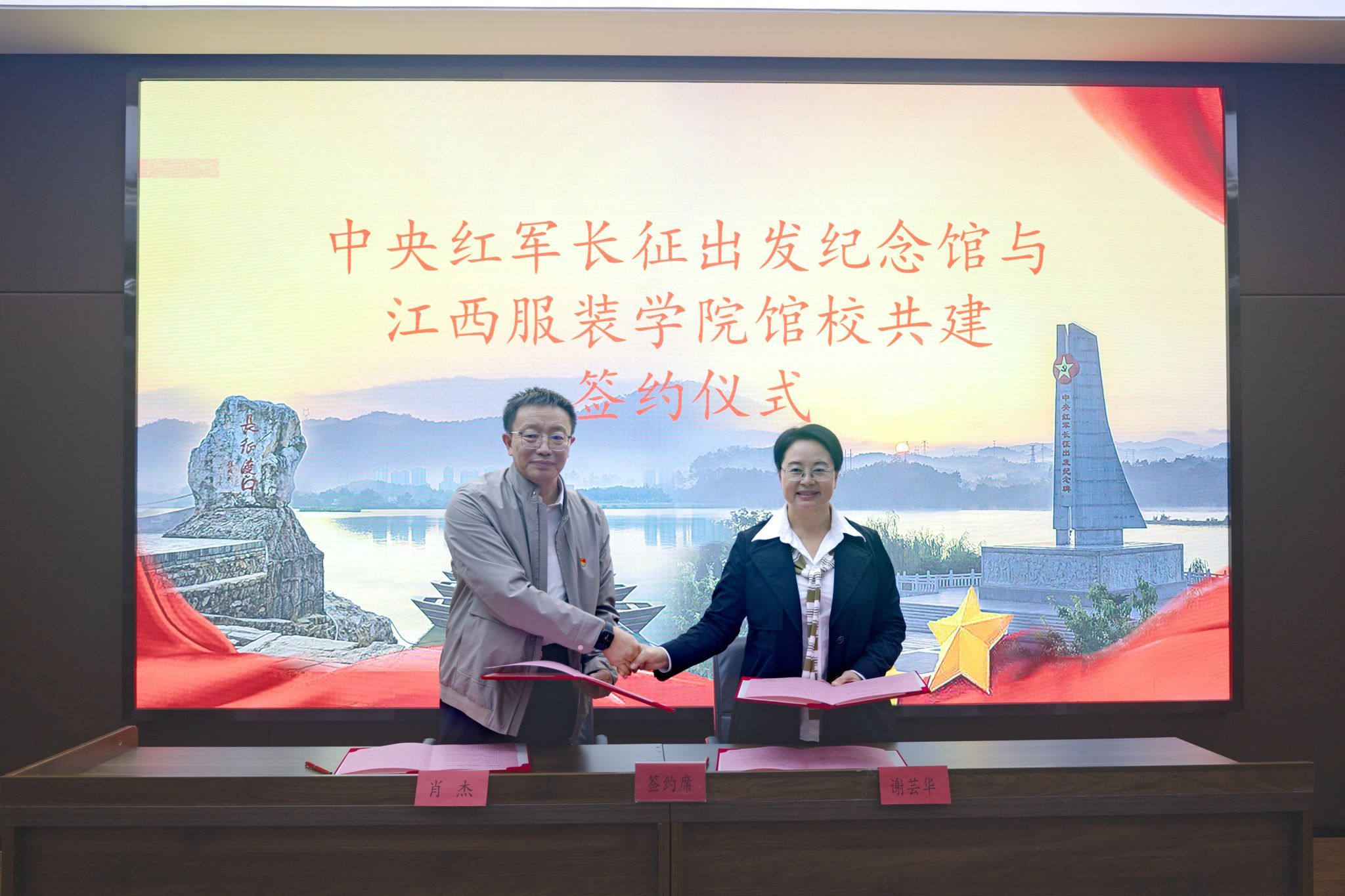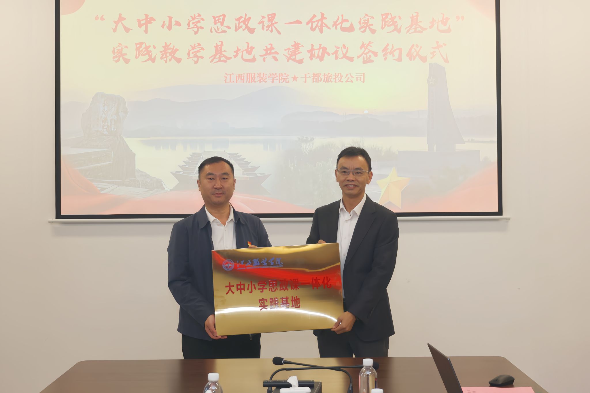 12日上午,“大中小学思政课一体化实践基地”揭牌仪式在于都县长征源旅游投资开发有限公司会议室举行。刘成松与沈新建共同为基地揭牌,肖杰代表学校与于都旅投签署校企共建协议。仪式由长征源旅游投资开发有限公司副总经理陈明主持。